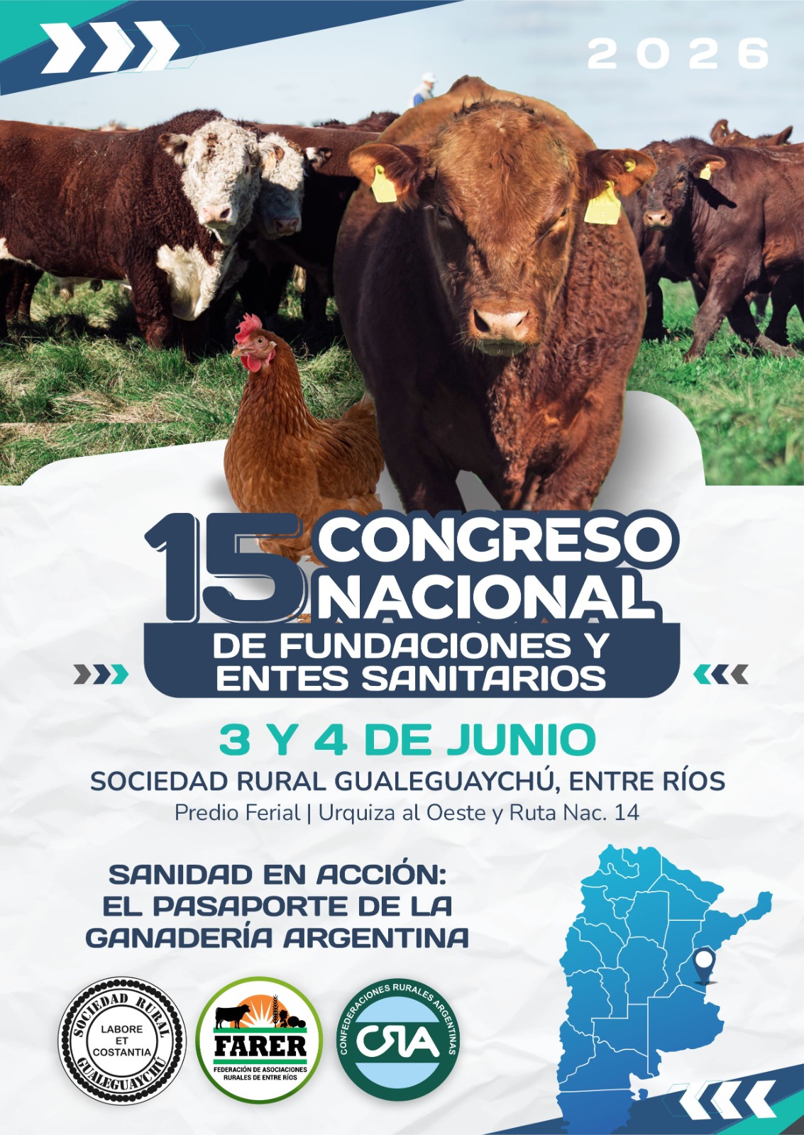 Bajo el lema “Sanidad en acción: el pasaporte de la ganadería argentina”, el evento se desarrollará los días 3 y 4 de junio de 2026 en el Auditorio de la Sociedad Rural Gualeguaychú, ubicado en Urquiza al oeste y ruta nacional 14. La organización estará a cargo de Confederaciones Rurales Argentinas (CRA), la Federación de Asociaciones Rurales de Entre Ríos (FARER) y la Sociedad Rural Gualeguaychú (SRG).