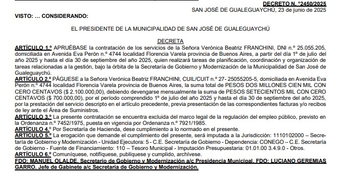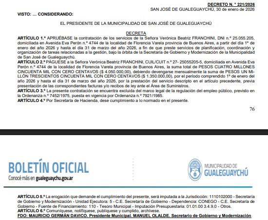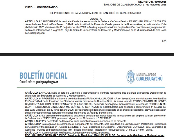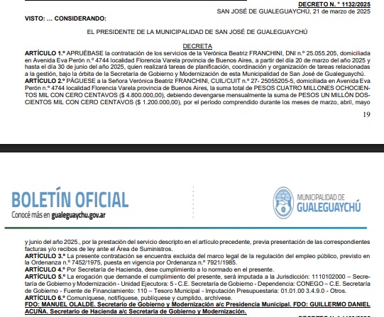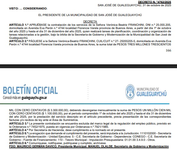 Franchini ha sido contratada de manera sostenida -según la información que se desprende de los cinco decretos publicados en el Boletín Oficial de la Municipalidad de Gualeguaychú- desde el 20 de marzo de 2025 hasta la actualidad, para tareas coordinadas por la Secretaría de Gobierno y Modernización que dirige Manuel Olalde. Franchini no reside en Gualeguaychú.
