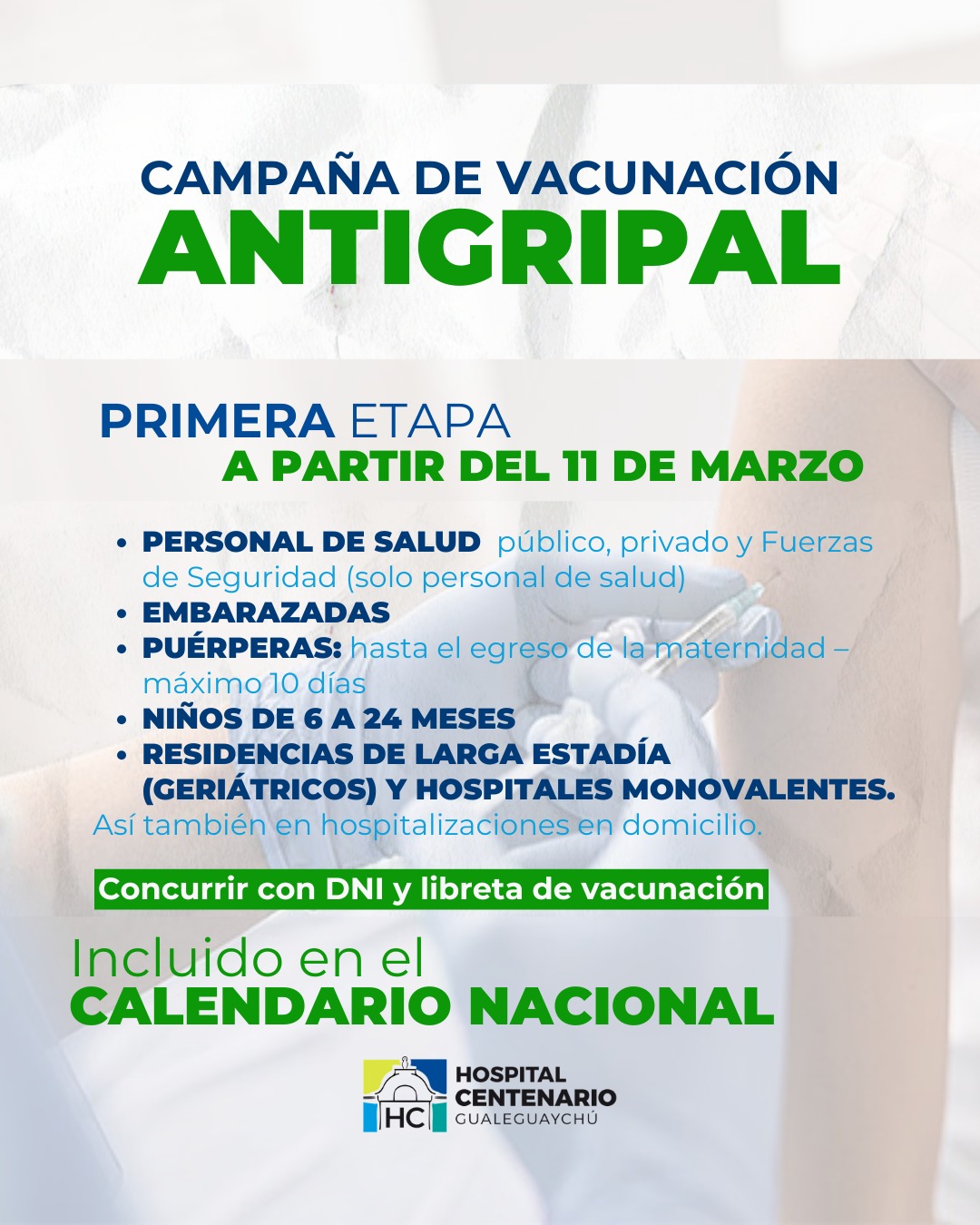 El Hospital Centenario de Gualeguaychú se sumará desde el 11 de marzo a la Campaña Nacional de Vacunación Antigripal, una estrategia sanitaria impulsada por el Ministerio de Salud de la Nación Argentina con el objetivo de prevenir complicaciones asociadas al virus de la influenza en los sectores más vulnerables de la población.